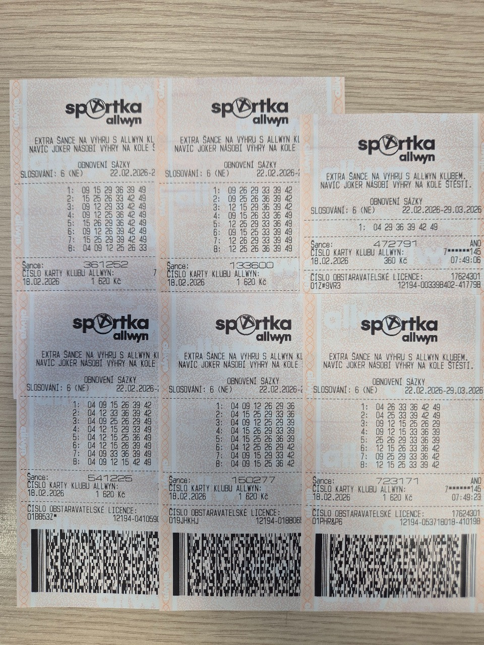 23. listopad 2025 / neděle - první tah 4,15,33, tj. 4x pátá 756,- Kč, druhý tah 9,25, šance 30,- Kč. CELKEM 786,- Kč.
