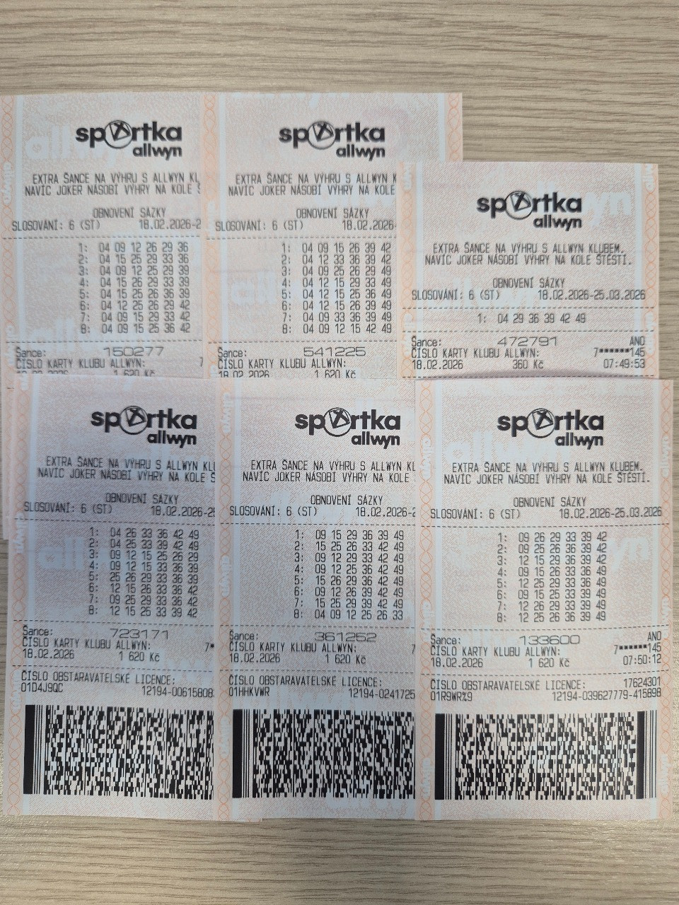 11. ledna 2026 / neděle - první tah 4,29,39, tj. 3x pátá 540,- Kč, druhý tah 36,42, šance 110,- Kč. CELKEM 650,- Kč.